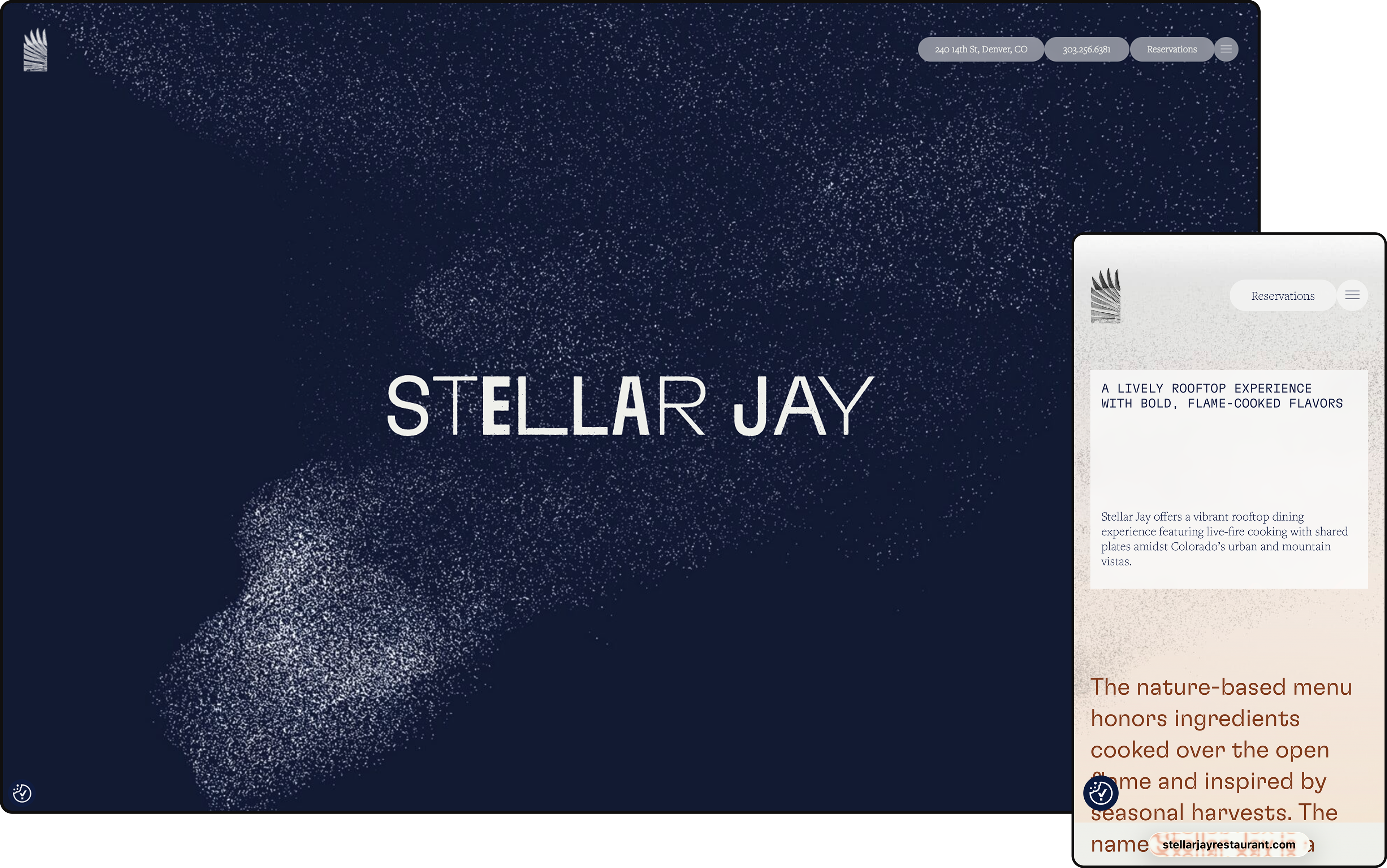 Stellar Jay is a rooftop restaurant, sitting atop the Populus hotel in Denver. 970 Design created the brand identity, proposing the name, "inspired by the iconic bird of Colorado, evoking a sense of altitude, celestial views, and the bold spirit of this species." To bring this concept to life, I created hand-drawn illustrations of the Jay's wings and signature mohawk. I then took pieces of the drawings and integrated them subtly into the menu designs. These illustrations have become an integral part of the brand, showing up on the ice cubes, coasters, and the digital environment.