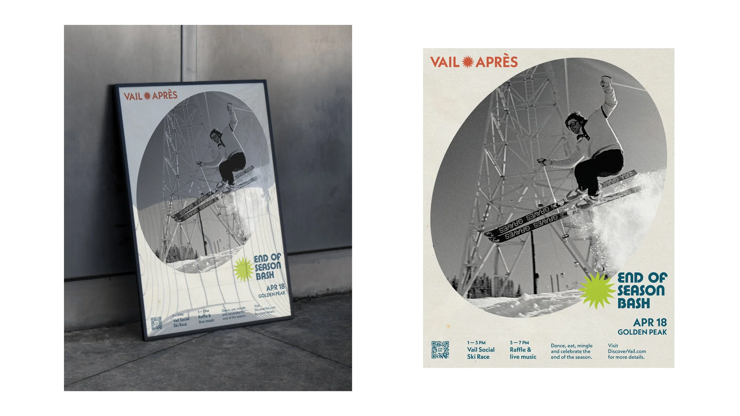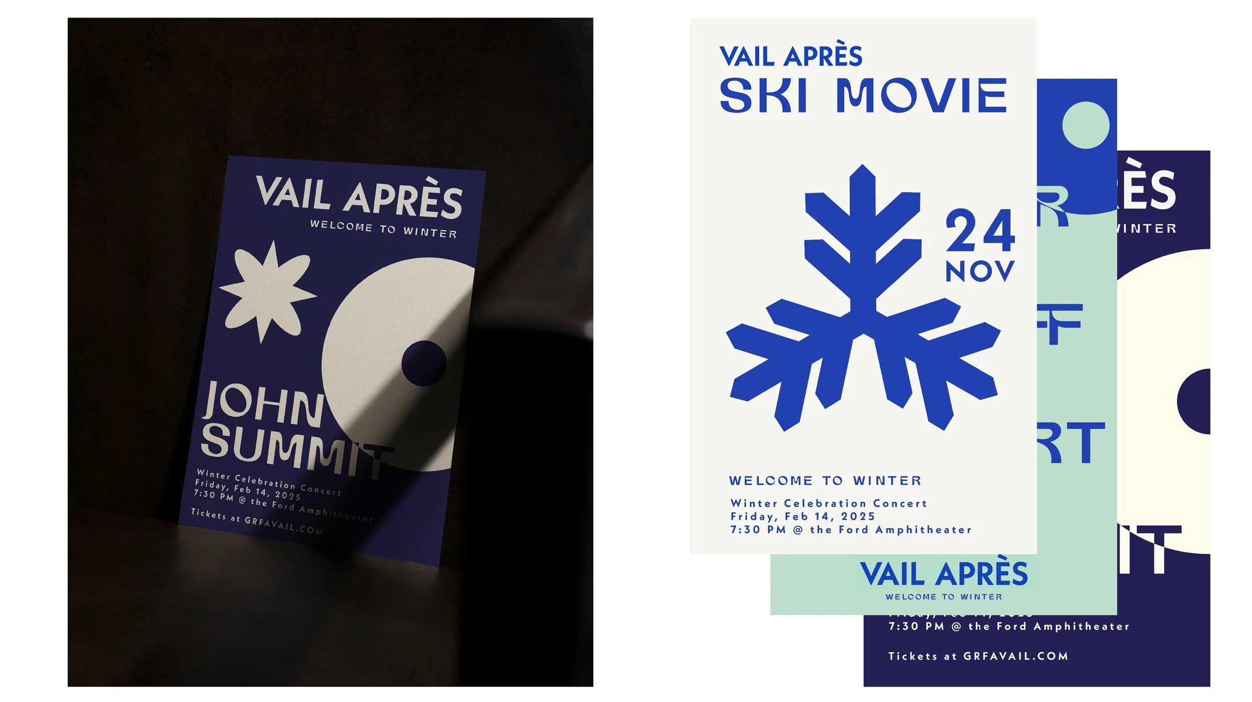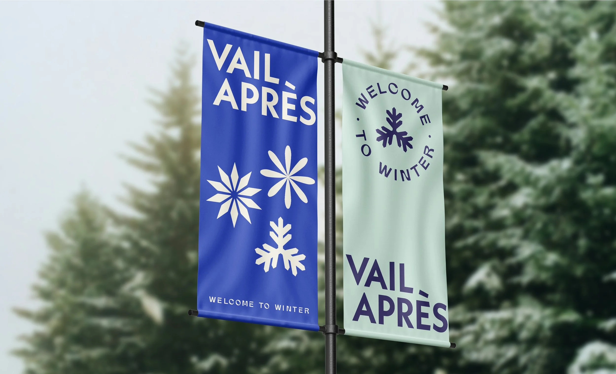 In order to do so, we (970 Design and I) renamed from Revely to Vail Après, broadening the brand from a holiday-focused identity to an all-encompassing après celebration. We then developed a dynamic branding system that changes with the seasons, split into spring and winter. Each has its own distinctive yet cohesive colors, branding symbols, and taglines, brought to life through vibrant and energetic imagery. This captured the lively spirit of spring and winter in the mountains and created a recognizable branding system that gave the Town of Vail the flexibility they need.