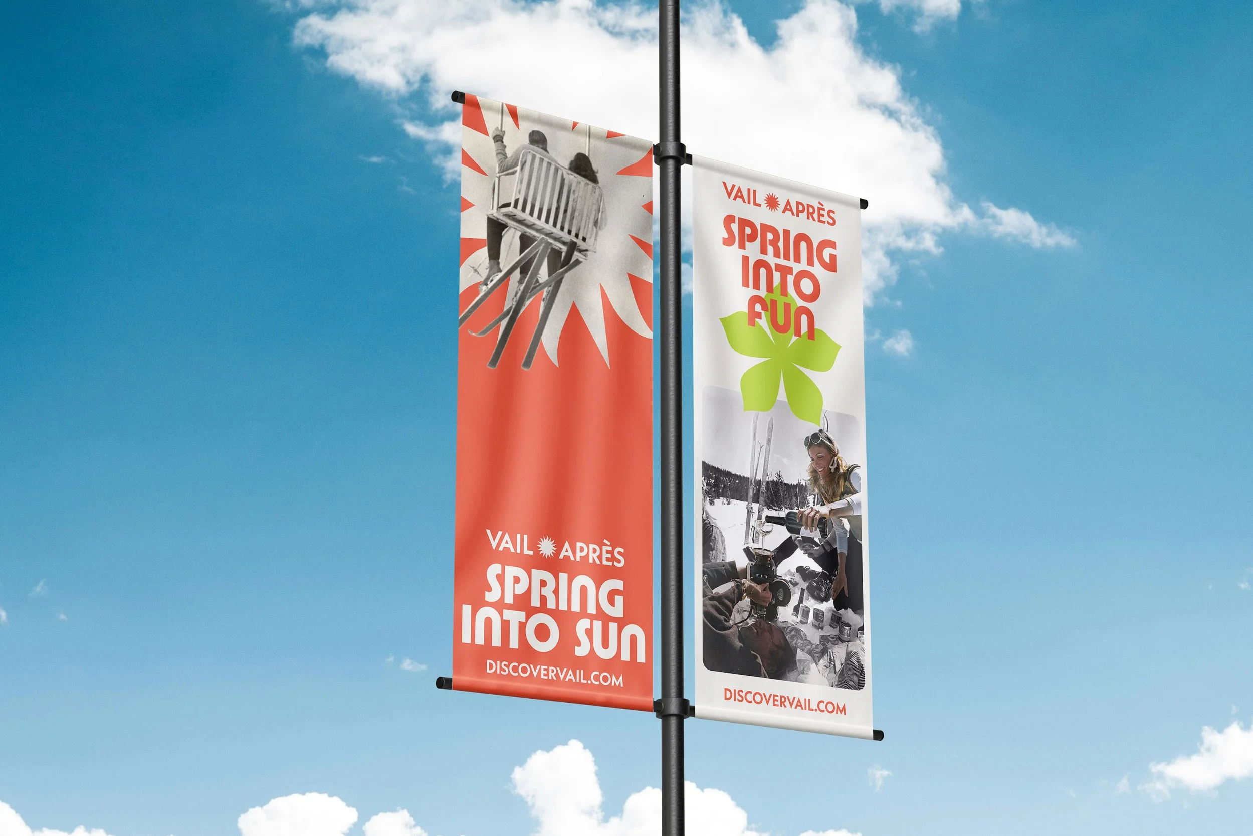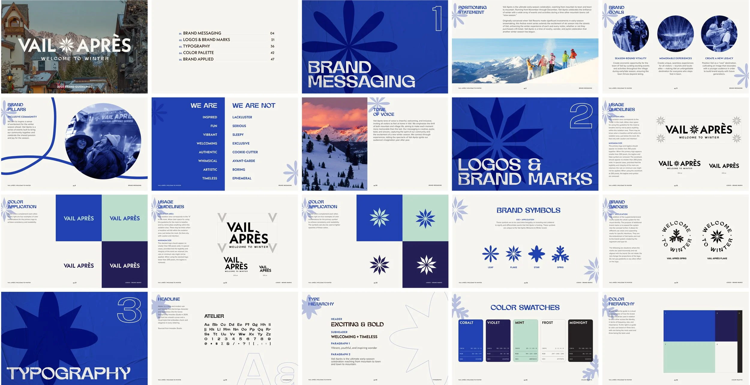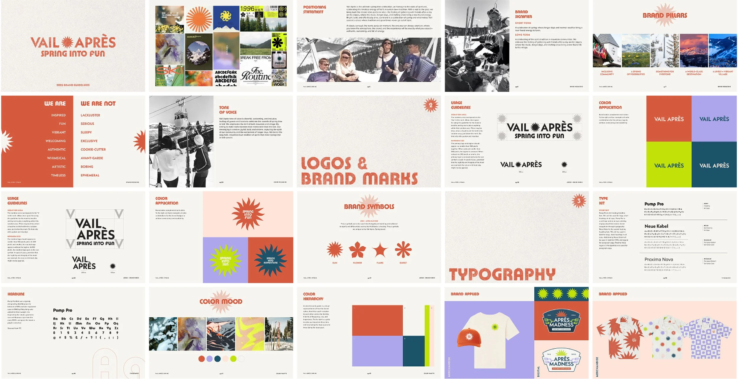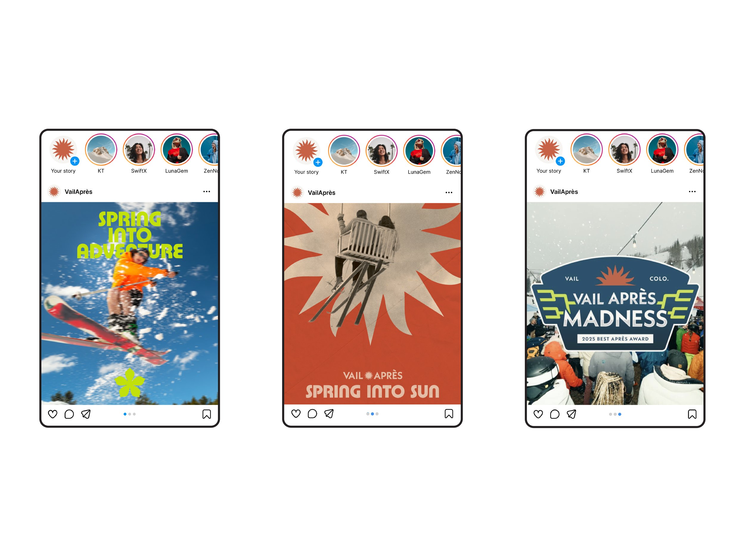 In order to do so, we (970 Design and I) renamed from Revely to Vail Après, broadening the brand from a holiday-focused identity to an all-encompassing après celebration. We then developed a dynamic branding system that changes with the seasons, split into spring and winter. Each has its own distinctive yet cohesive colors, branding symbols, and taglines, brought to life through vibrant and energetic imagery. This captured the lively spirit of spring and winter in the mountains and created a recognizable branding system that gave the Town of Vail the flexibility they need.