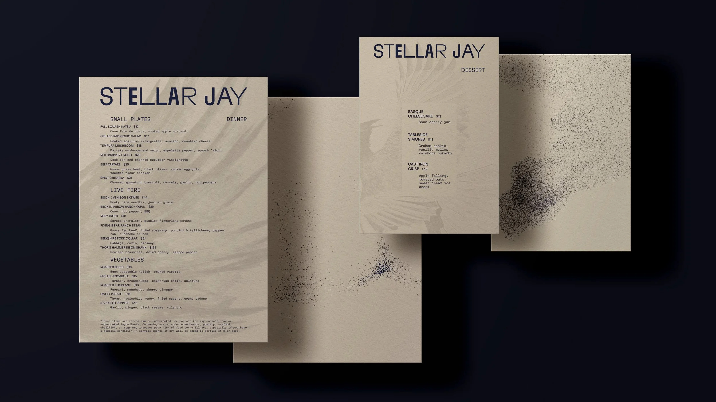 Stellar Jay is a rooftop restaurant, sitting atop the Populus hotel in Denver. 970 Design created the brand identity, proposing the name, "inspired by the iconic bird of Colorado, evoking a sense of altitude, celestial views, and the bold spirit of this species." To bring this concept to life, I created hand-drawn illustrations of the Jay's wings and signature mohawk. I then took pieces of the drawings and integrated them subtly into the menu designs. These illustrations have become an integral part of the brand, showing up on the ice cubes, coasters, uniforms, and the digital environment.